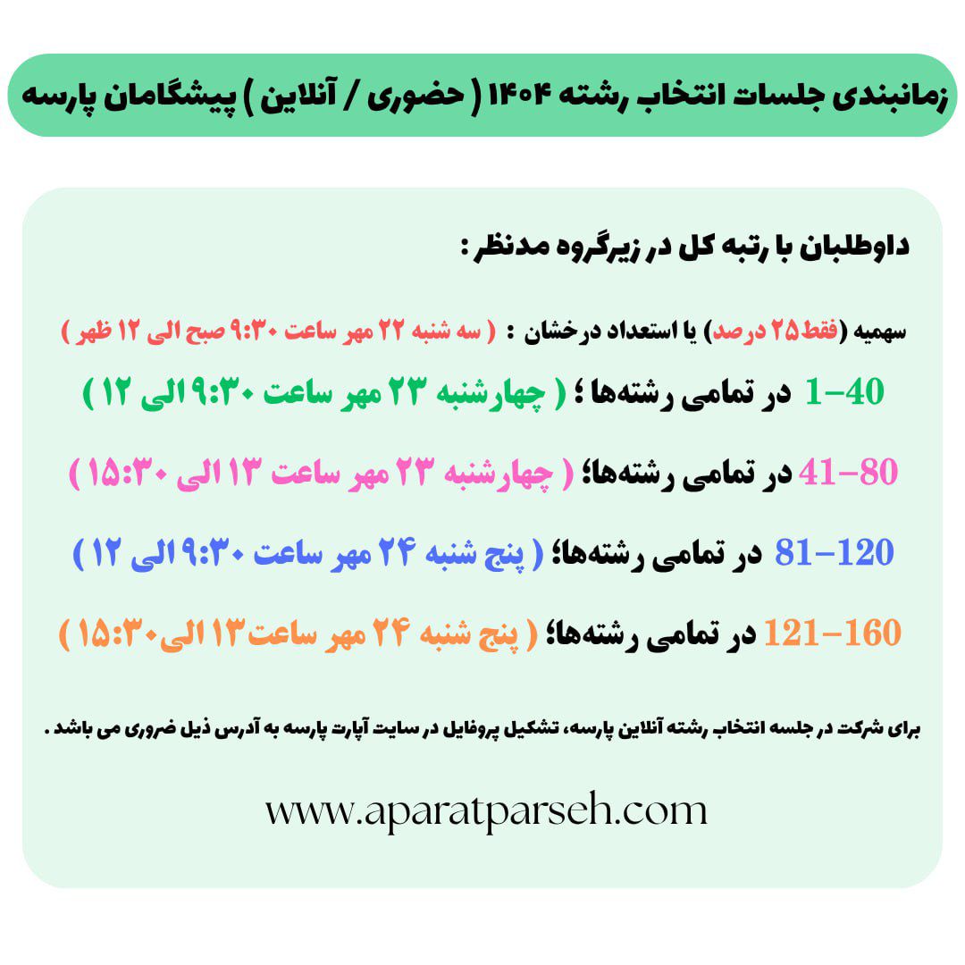 🔹لذا خواهشمندیم در همان زمان اعلام شده با توجه به رتبه کل و رشته مورد علاقه در جلسه حاضر شوید.